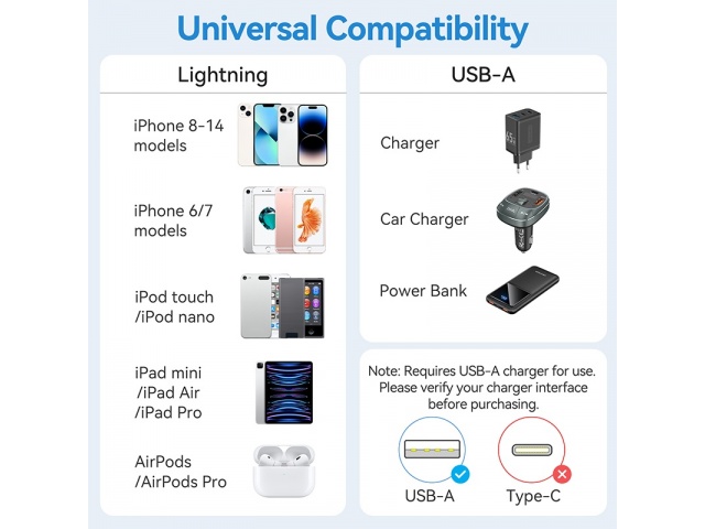 En stock En stock Cable USB-A a Lightning 2.4A 2M Celeste LAMSH Vention Regístrate para ver $ precios Cód.ACC017265