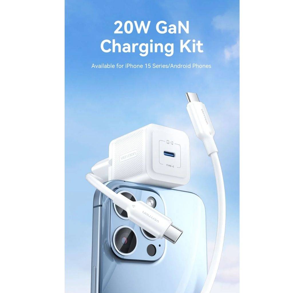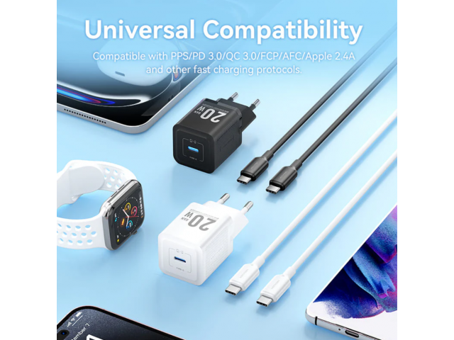 Cargador USB-C GaN de 1 puerto (20 W) con cable USB-C a USB-C (1 m), color negro