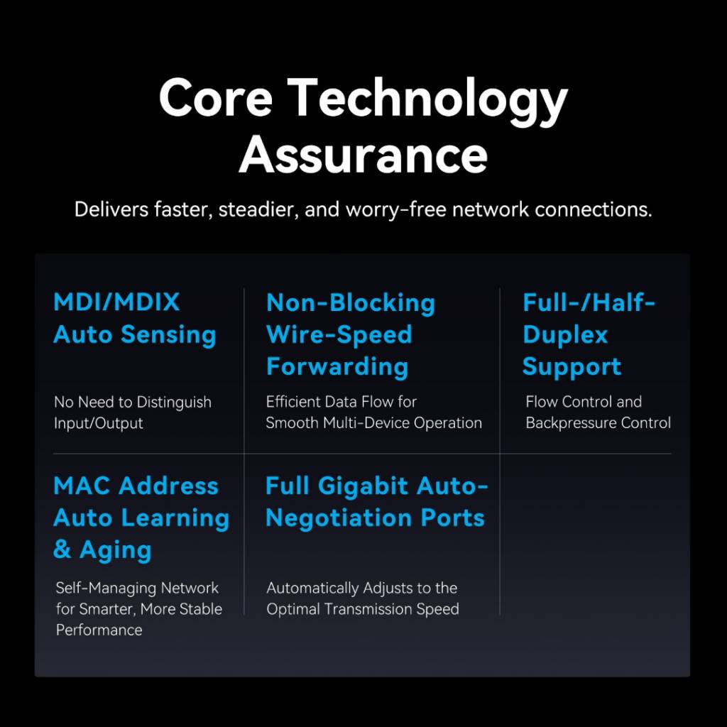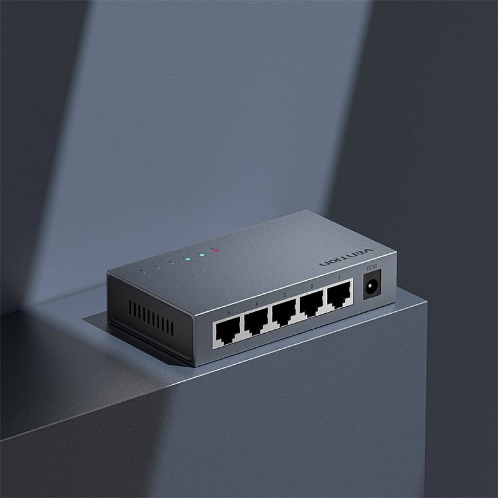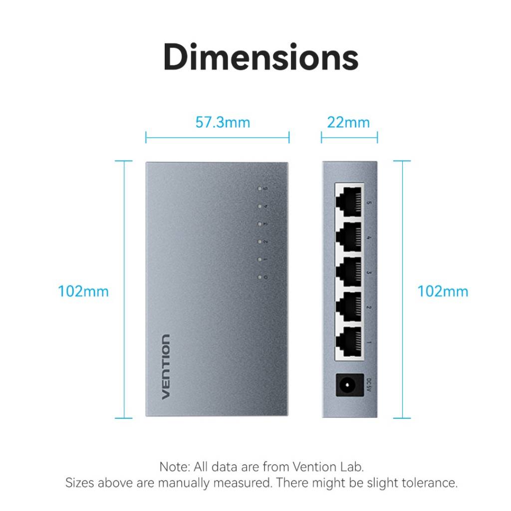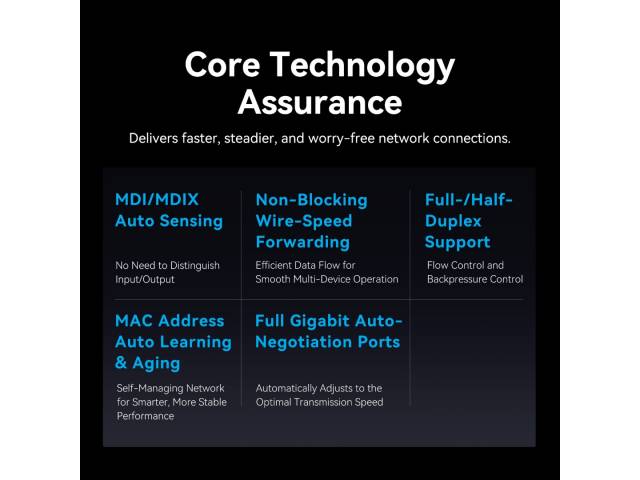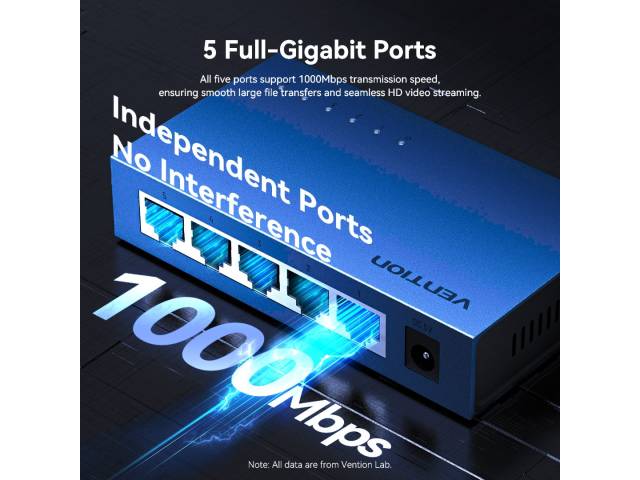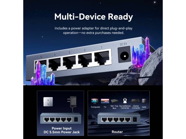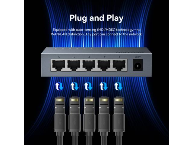Características: 5 puertos RJ45 con negociación automática de 10/100/1000 Mbps; MDI/MDIX automático; Compatibilidad con modo dúplex completo/semidúplex; Autoaprendizaje y envejecimiento de direcciones MAC; Reenvío a velocidad de cable sin bloqueo
