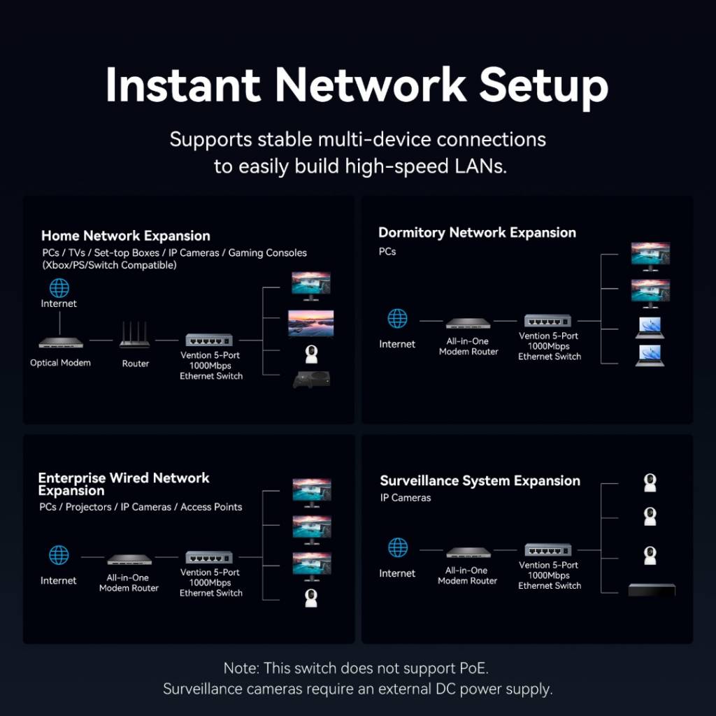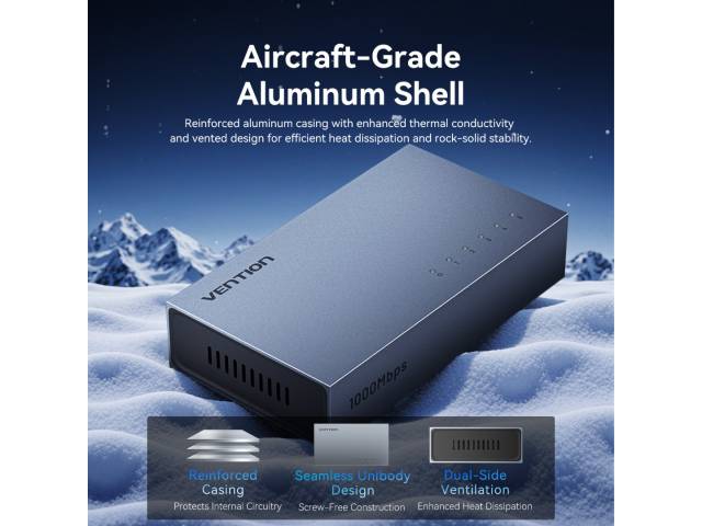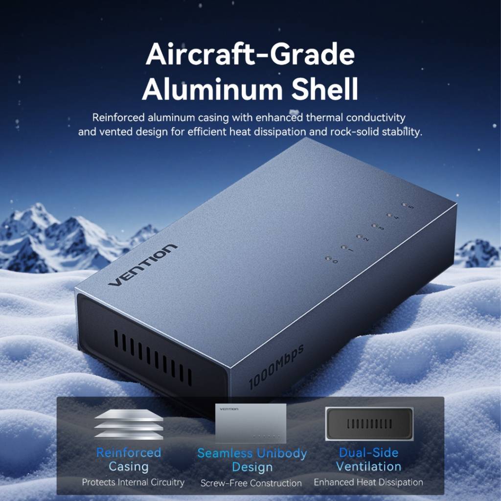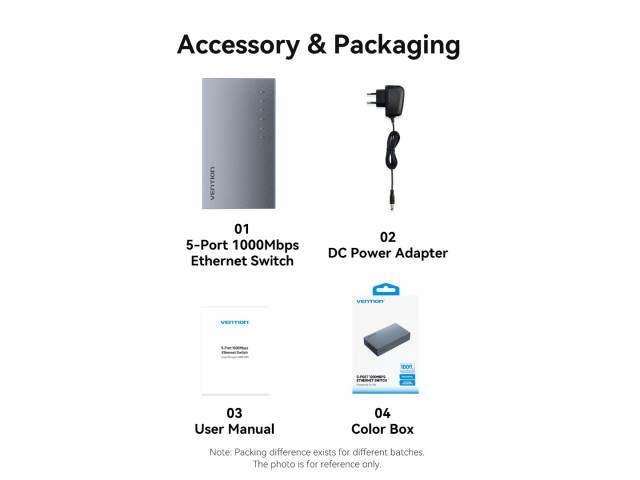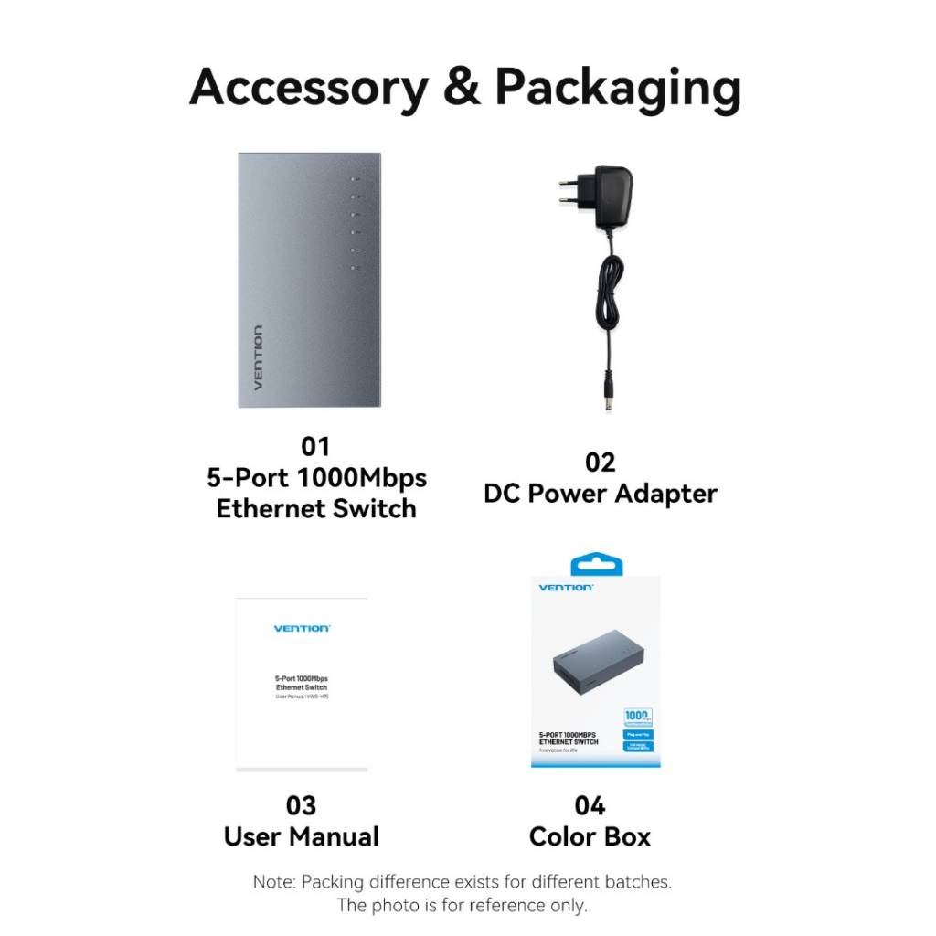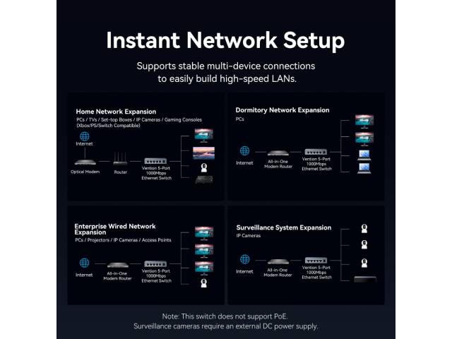 Características: 5 puertos RJ45 con negociación automática de 10/100/1000 Mbps; MDI/MDIX automático; Compatibilidad con modo dúplex completo/semidúplex; Autoaprendizaje y envejecimiento de direcciones MAC; Reenvío a velocidad de cable sin bloqueo