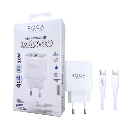Cargador ROCA 20W USB A + USB C/ PD Cable USB C a USB C / 60W / 100cm Blanco (RC-TC-01)