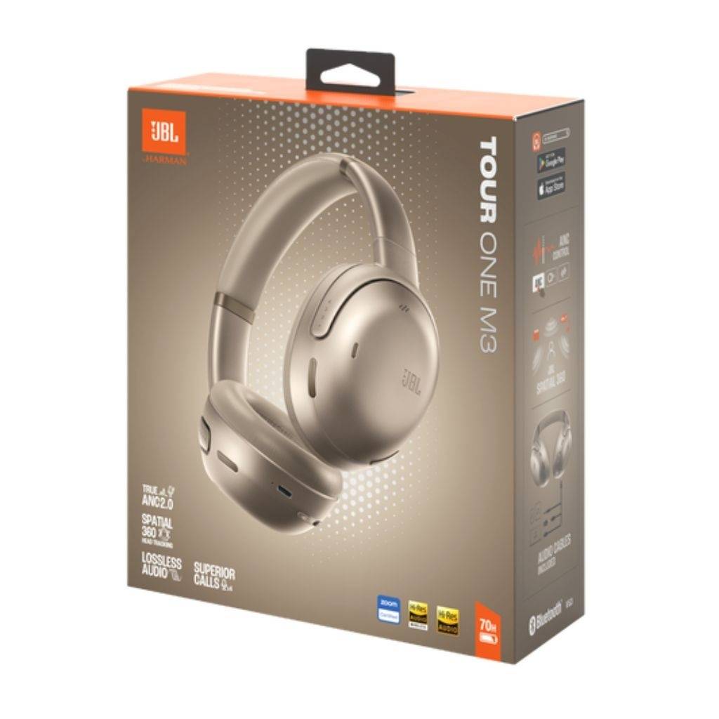 Auriculares JBL Tour One M3 inalámbricos con Bluetooth 5.3 para conexión estable y sonido sin cables. Sonido JBL Signature Sound con graves profundos y equilibrio para música, videos y llamadas. Cancelación activa de ruido adaptativa que se ajusta automáticamente al entorno. Micrófonos integrados con reducción de ruido para llamadas claras y nítidas. Hasta 60 h de batería con ANC activado y controles táctiles integrados en las orejeras. Diseño cómodo, elegante y plegable en color champagne para uso diario.