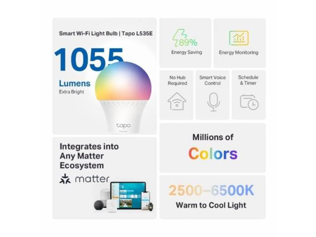 Compatible con Matter. Gracias a la compatibilidad con Matter, Tapo L535E puede funcionar sin problemas con otros productos certificados de otras plataformas.