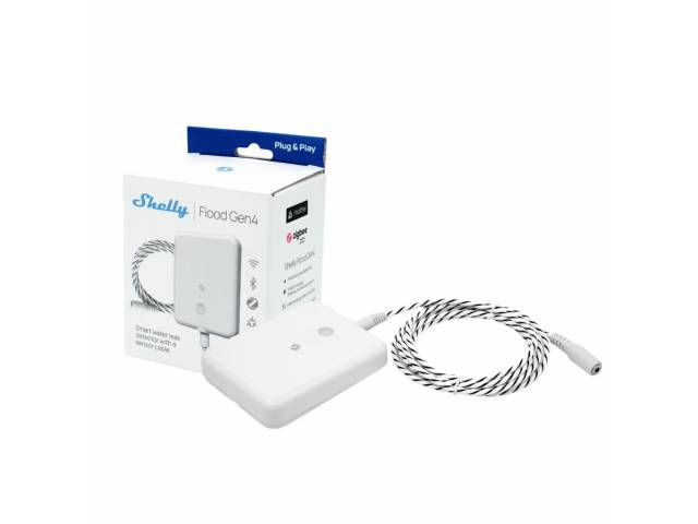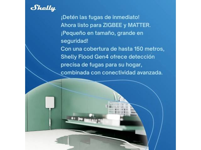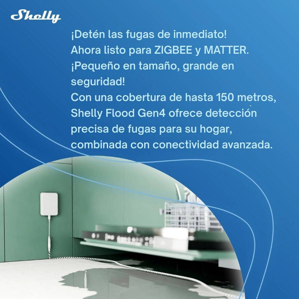 El Shelly Flood Gen4 es un sensor inteligente de detección de fugas de agua y temperatura, que destaca por su conectividad multiprotocolo (Wi-Fi, Bluetooth, Zigbee y Matter) y un cable sensor extensible de 2 metros. Está diseñado para alertar a los usuarios instantáneamente sobre posibles daños por agua a través de notificaciones móviles y una alarma sonora integrada.