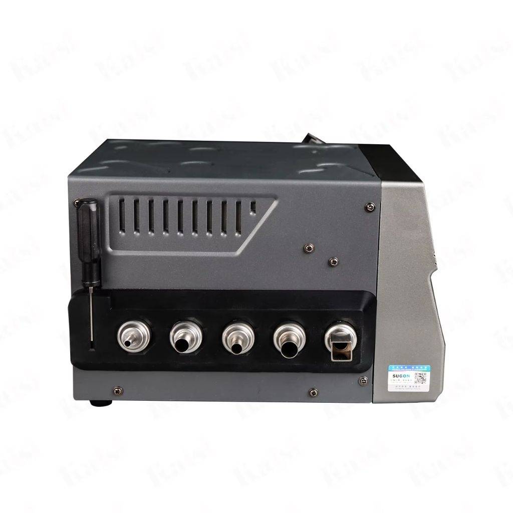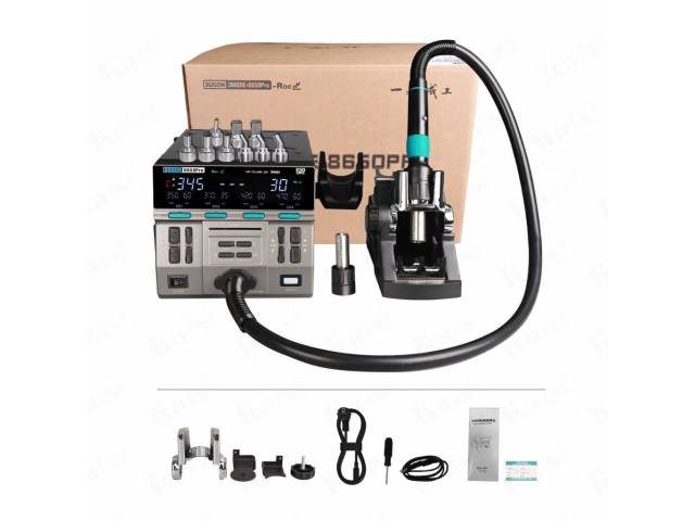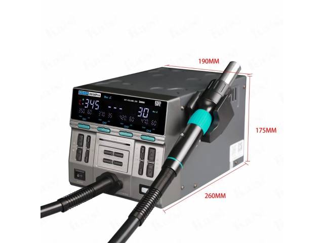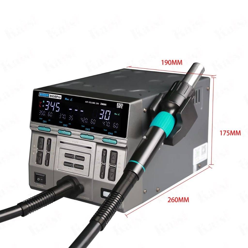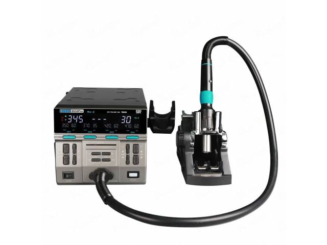 Diseño innovador: Mango enchufable para facilitar el reemplazo de piezas, soporte para boquillas integrado, y un asiento para dormir ajustable.Enfriamiento automático: Al colocar el mango en el soporte, la estación entra en modo de reposo y enfría el elemento calefactor para prolongar su vida útil.