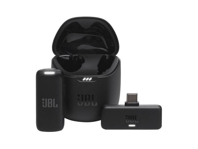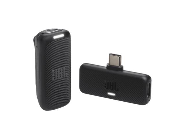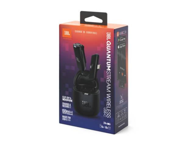 Micrófono JBL Quantum Stream Wireless con conexión inalámbrica de baja latencia 2.4 GHz mediante dongle USB-C, ideal para streaming, vlogs y grabaciones on-the-go.